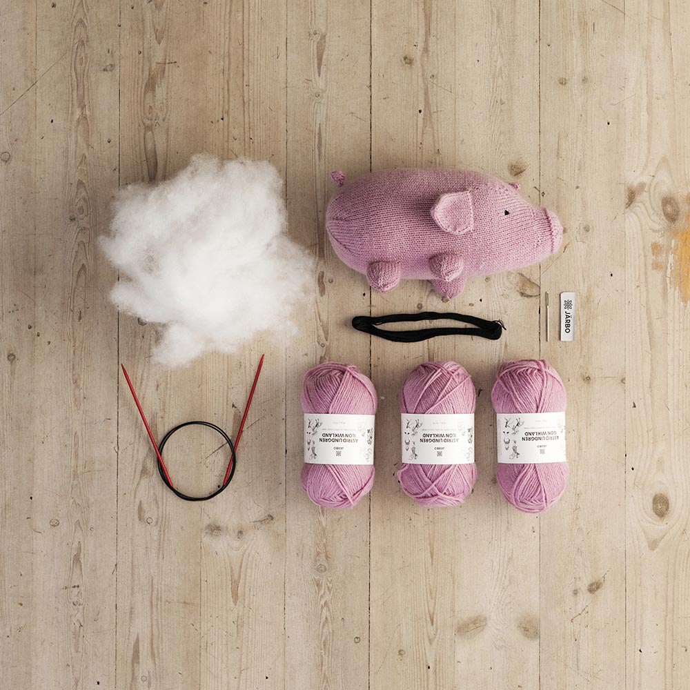 Komplett paket med garn, mönster, stickor och vadd till grisen Bamse.